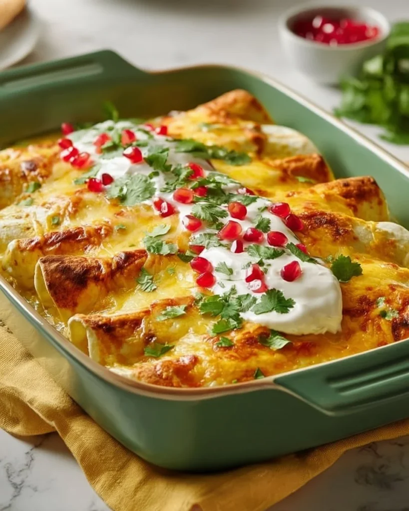 These enchiladas are best served hot from the oven. You can top them with sour cream, chopped cilantro, or sliced jalapeños to add extra flavor. Pair them with a side of rice or beans for a complete meal.