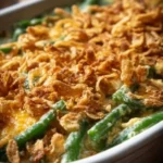 A comforting dish combining green beans, creamy mushroom soup, and crispy fried onions, perfect for family dinners and gatherings.