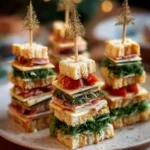 - Take a skewer and stack the sandwich pieces to resemble a Christmas tree, alternating layers for a colorful look.