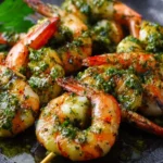 Shrimp with Pesto can be served as an appetizer or a main dish. You can place the skewers directly on a platter and garnish with fresh herbs or extra lemon wedges. Pair it with a side salad, rice, or pasta to complete the meal.